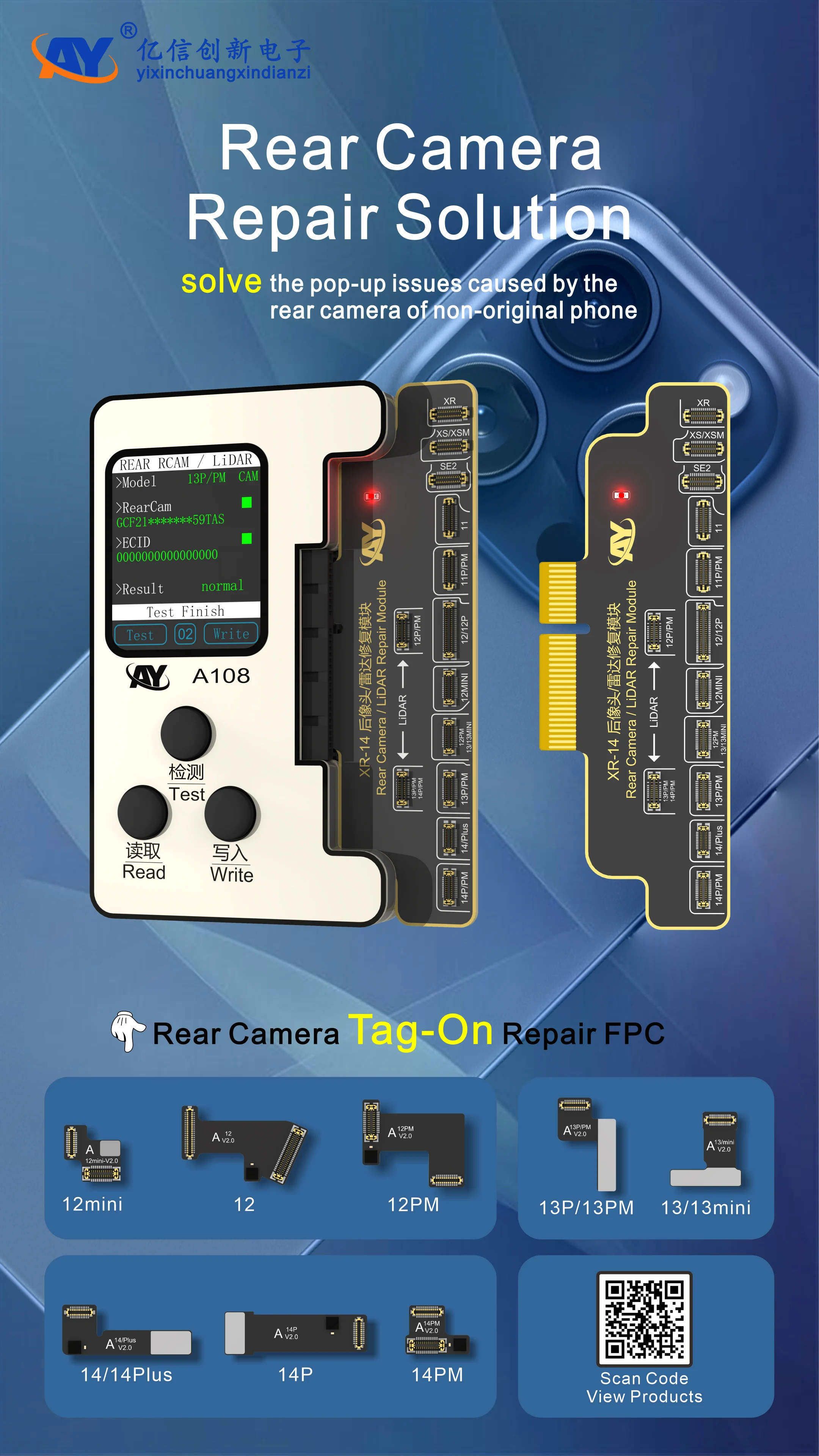 AY A108 BOX programmer is suitable for iPhone 8-14 Pro Max battery/8-14PM screen original sound/X-14PM Face ID repair/12-14PM camera repair. A108 programmer is suitable for iPhone X-12 Pro Max Face ID repair without soldering. The A108 BOX Restore programmer allows you to read and write information about your Apple iPhone battery, Face ID, and other data. Battery test board and dot projector test board and camera repair test board, True Tone display repair board are compatible with our mobile phone repair programmer.
